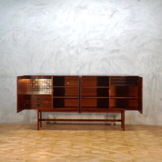 ヨハネス・アンダーセンの作品で、チーク材の美しい木目と蛇腹が印象的なサイドボード。