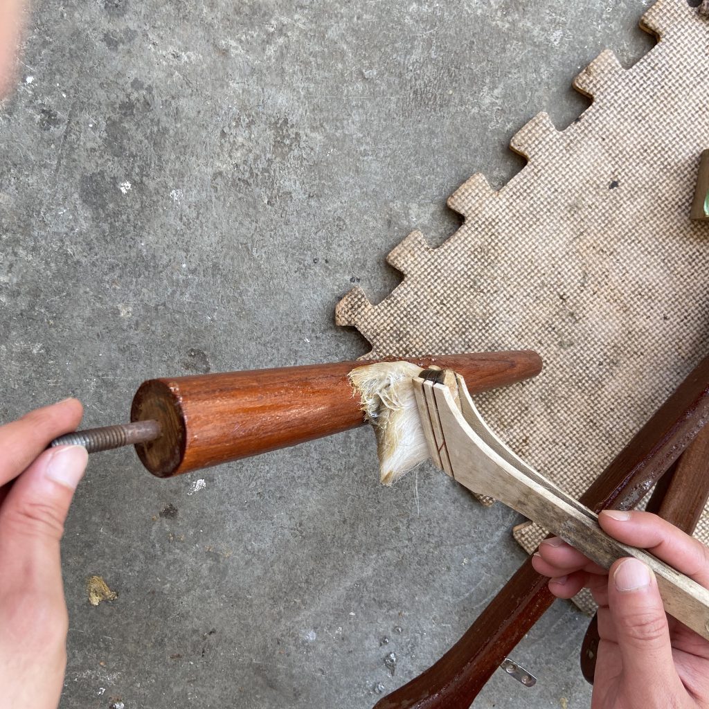 材質はチーク 木部に傷をつけないよう、タッカーを一つ一つ外し…