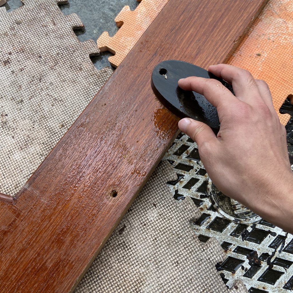 木部の剥離作業 今回は塗装がとても強力なため、剥離剤を塗り、…