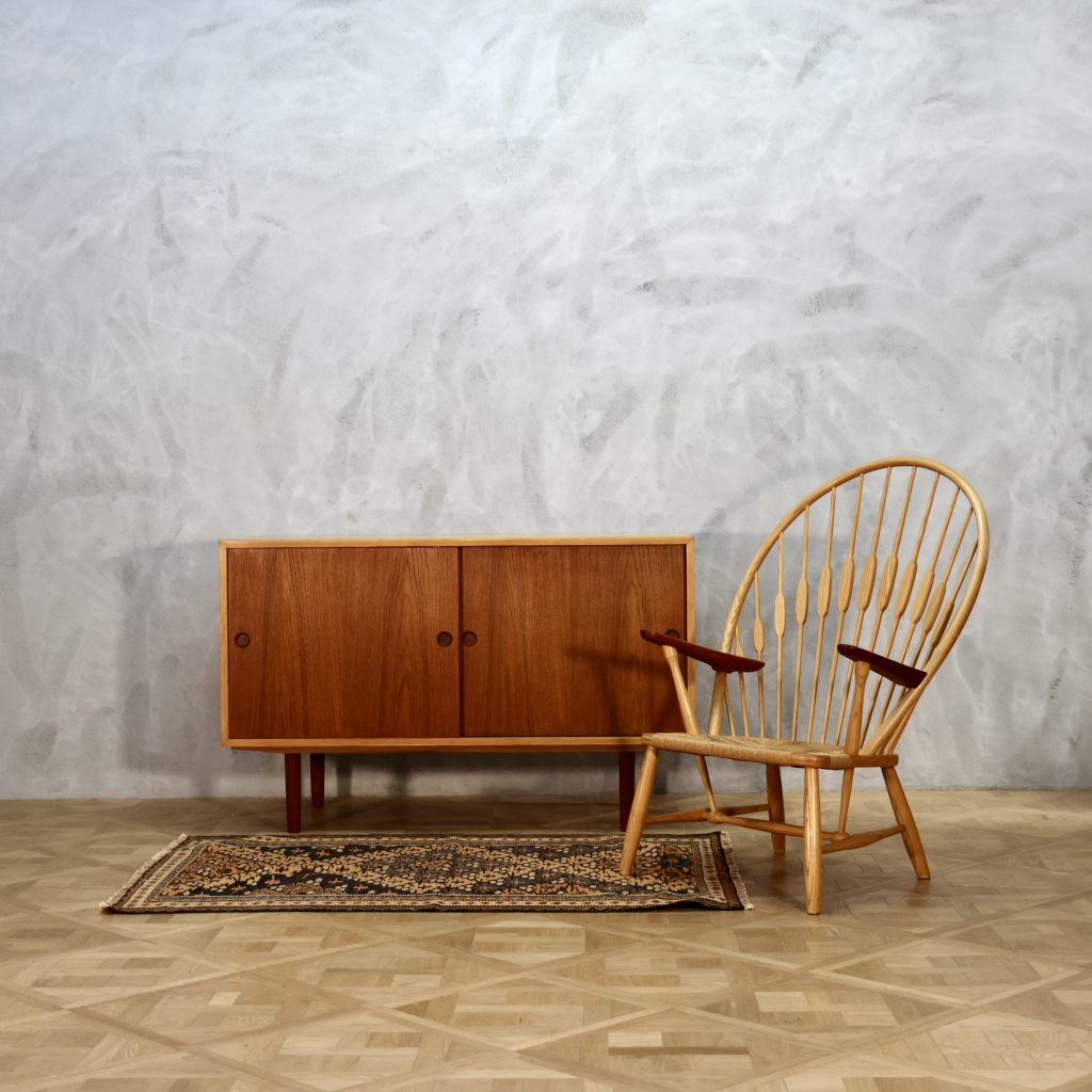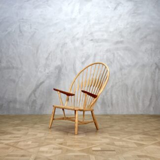 Hans J. Wegnerがデザインし、孔雀が羽を広げたフォルムのピーコックチェア。
